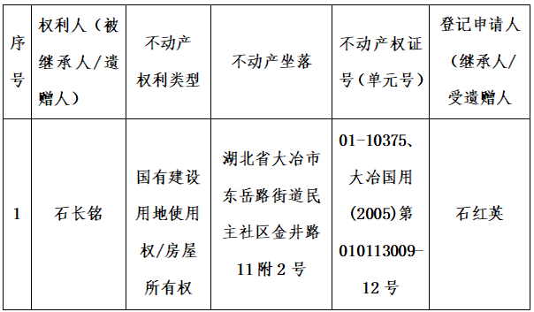 大冶市不动产登记中心不动产权继承公告 (2026)第190号