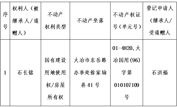 大冶市不动产登记中心不动产权继承公告(2026)第191号