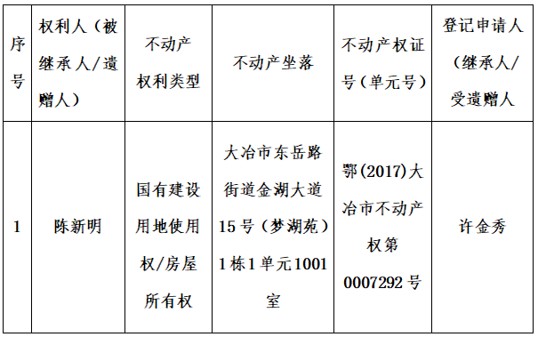 根据《不动产登记暂行条例实施细则》第十四条的规定,经初步查验,不动产登记机构拟对下列不动产权利办理不动产继承登记。根据《不动产登记暂行条例实施细则》第十七条的规定,现予公告。如有异议,请自本公告之日起 十五 个工作日内,将异议书面材料送达不动产登记机构。逾期无人提出异议或者异议不成立的,不动产登记机构将予以登记。