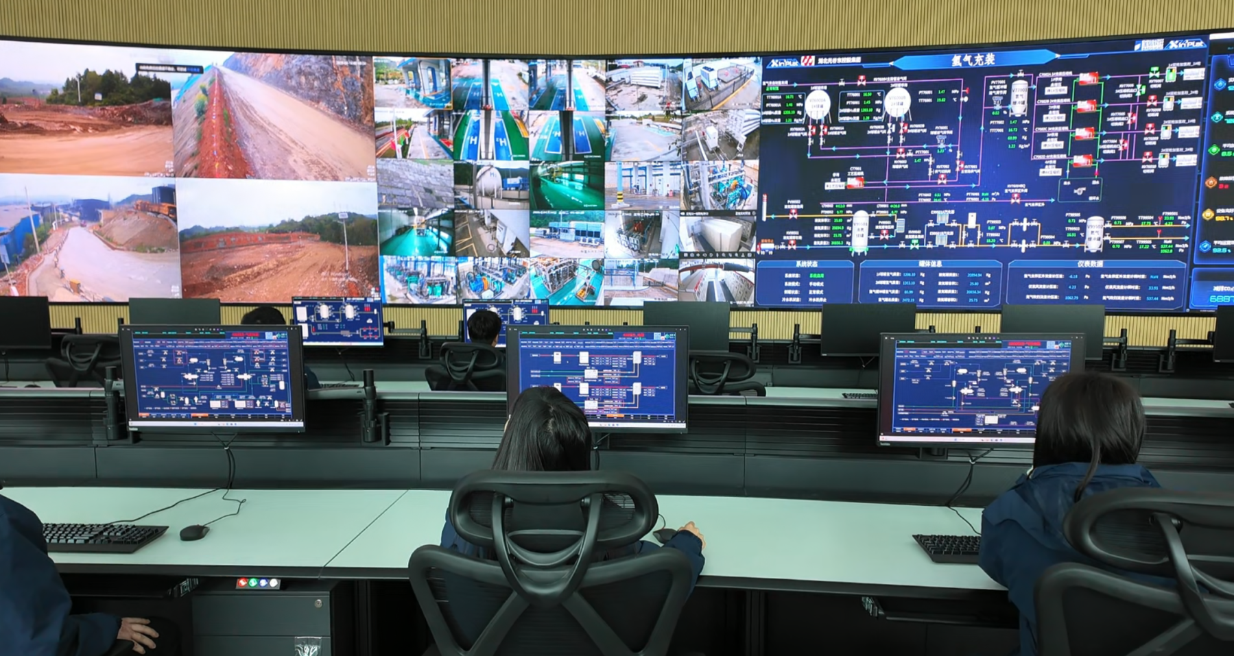 当天,记者在现场看到,近百平方米的高清大屏占据整面墙壁,五大功能板块分区清晰、数据实时刷新。工作人员轻点鼠标,姜桥制氢工厂的氢气充装流程实时跳转;全市氢能车辆的行驶轨迹清晰可辨;数据跳动间,大冶东和奥体大道两座综合能源站的运营状态、盛创矿业氢能工程机械的作业画面、双碳管理平台的碳交易数据同步呈现,氢能全产业链的每一个环节都清晰可见、全程可溯。