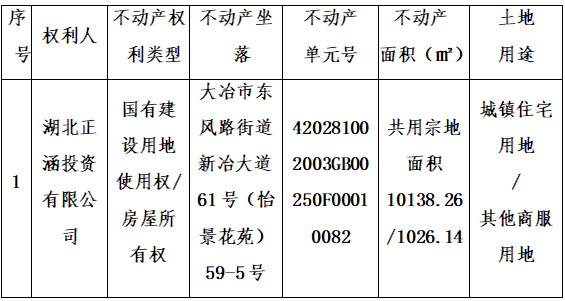 湖北正涵投资有限公司对坐落于大冶市东风路街道新冶大道61号(怡景花苑)59-5号不动产申请登记,由于房屋买卖合同未在住建部门备案,现根据《不动产登记暂行条例》、《不动产登记暂行条例实施细则》、《不动产登记操作规范(试行)》之规定,对该申请予以审查并予公告。如对上述内容有异议,请自本公告之日起十五个工作日内将异议书面材料送达大冶市不动产登记中心综合窗口。逾期无人提出异议或者异议不成立的,我机构将予以登记并颁发不动产权证书。