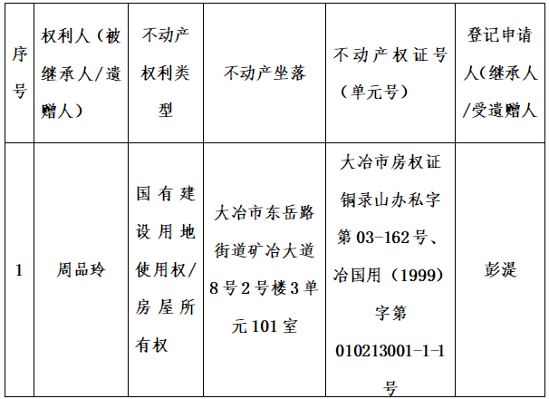 根据《不动产登记暂行条例实施细则》第十四条的规定,经初步查验,不动产登记机构拟对下列不动产权利办理不动产继承登记。根据《不动产登记暂行条例实施细则》第十七条的规定,现予公告。如有异议,请自本公告之日起 十五 个工作日内,将异议书面材料送达不动产登记机构。逾期无人提出异议或者异议不成立的,不动产登记机构将予以登记。