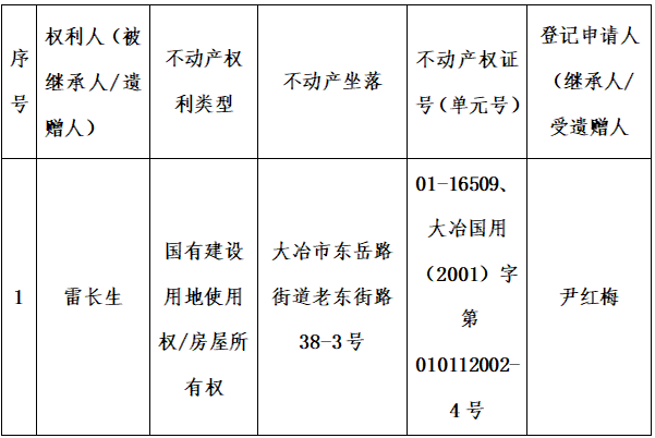 大冶市不动产登记中心不动产权继承公告(2026)第218号