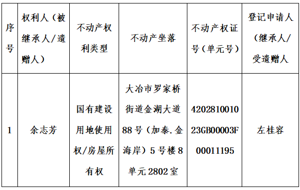 根据《不动产登记暂行条例实施细则》第十四条的规定,经初步查验,不动产登记机构拟对下列不动产权利办理不动产继承登记。根据《不动产登记暂行条例实施细则》第十七条的规定,现予公告。如有异议,请自本公告之日起 十五 个工作日内,将异议书面材料送达不动产登记机构。逾期无人提出异议或者异议不成立的,不动产登记机构将予以登记。