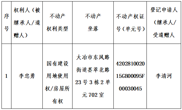 大冶市不动产登记中心不动产权继承公告(2026)第198号