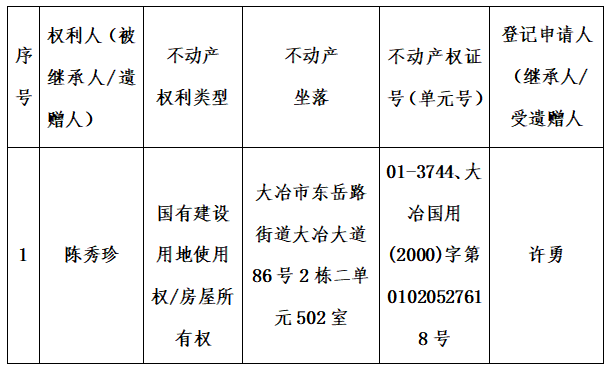 大冶市不动产登记中心不动产权继承公告(2026)第199号