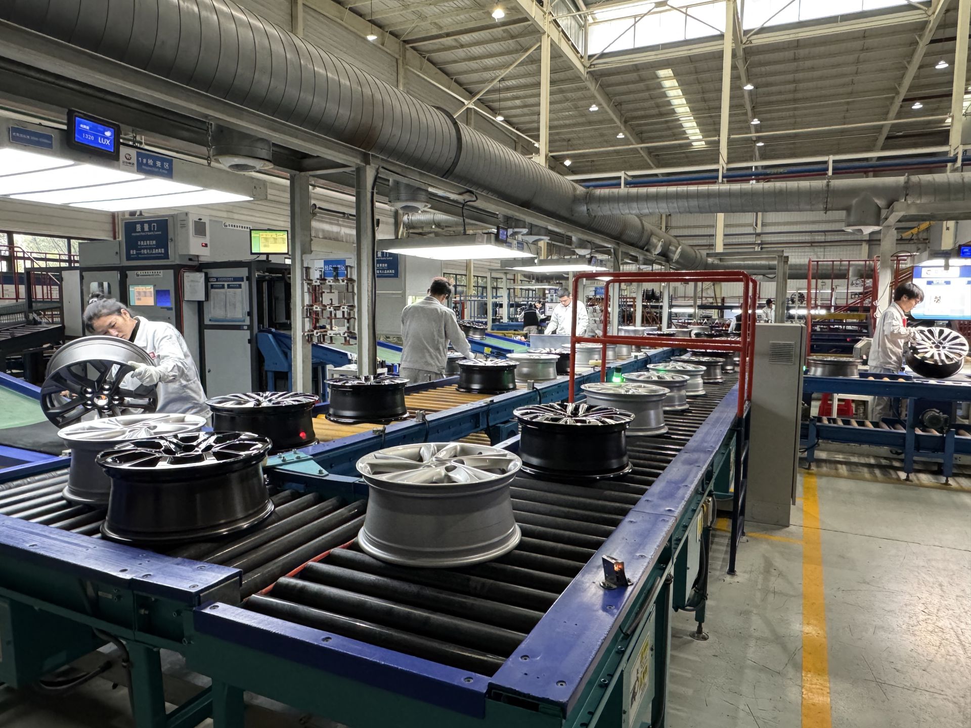 在立中车轮生产车间内,同样一派繁忙,一条条自动化生产线高速运转,熔炼铸造、热处理、精加工有序衔接,一排排质感精良的铝合金车轮源源不断走下生产线。