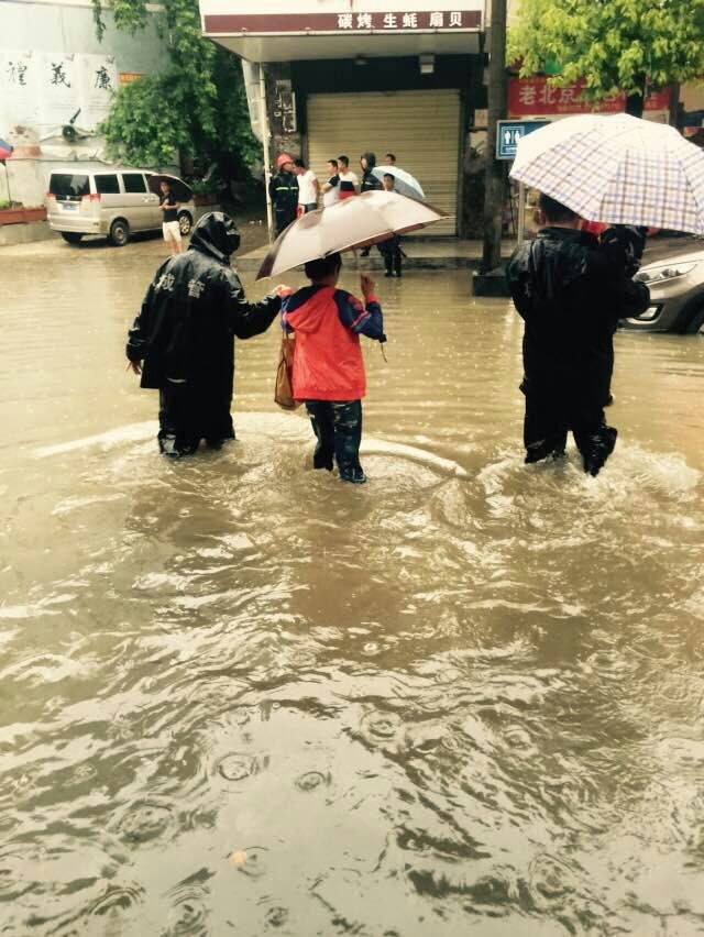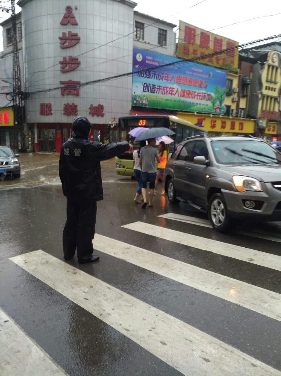 地质巷路段的积水已经有八九十厘米深,多名路人被困屋檐下,其中还有不少上学的孩子。正在附近执勤市城管大队一中队副中队长叶浩见此情况后,毫不犹豫地蹚过积水,将滞留在那里的孩子、老人背到对街无水区域,并协助疏导交通、引导行人过马路。“他们最近每天都在这里执法,基本每天早上送孩子去上学都能看到他们的身影,他们真的不容易。”一名学生家长如是说。
