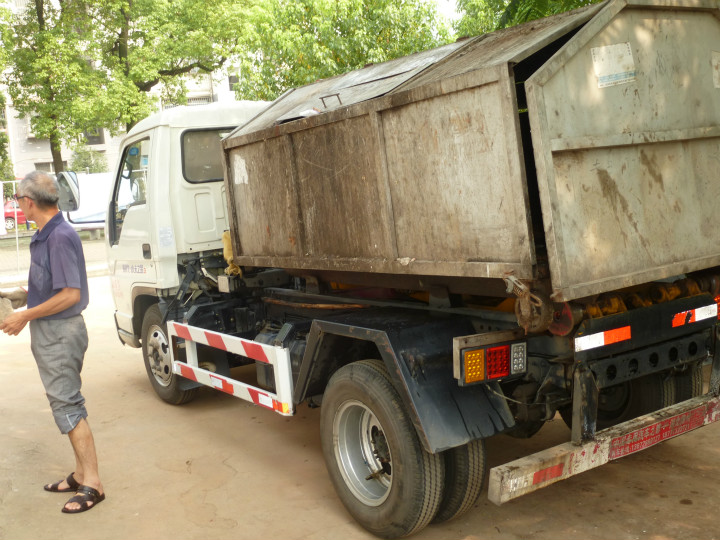 当天上午,记者在一小区看到深圳市升阳升清洁服务有限公司大冶分公司(以下简称“升阳升”大冶分公司)一辆车牌号为鄂B5KU78的垃圾钩臂车,其车后没有挂牌照。在现场,司机段师傅介绍,车子后面是有车牌的,被他一直放在单位里。