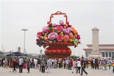 市园林绿化局相关负责人介绍,今年大花篮以花果篮为主景,篮内摆放着柿子、石榴、苹果等。花篮顶高17米,篮体高15.3米;底部采用心形图案,直径达50米;篮体南侧写有“祝福祖国,1949-2017”,北侧写有“喜迎十九大”。