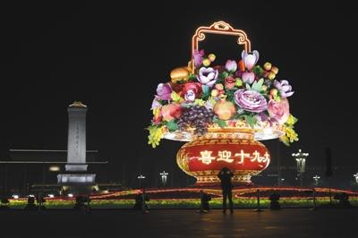 昨日,天安门广场,国庆广场中心花篮夜景照明亮相。新京报记者 侯少卿 摄