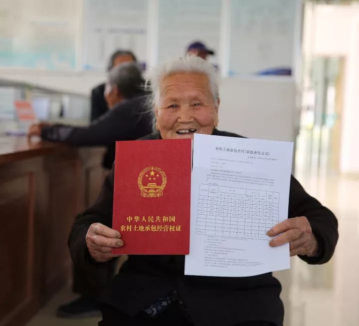 △2017年4月5日,江苏省海安县南莫镇唐庄村1组村民丁桂英喜领《农村土地承包经营权证》。